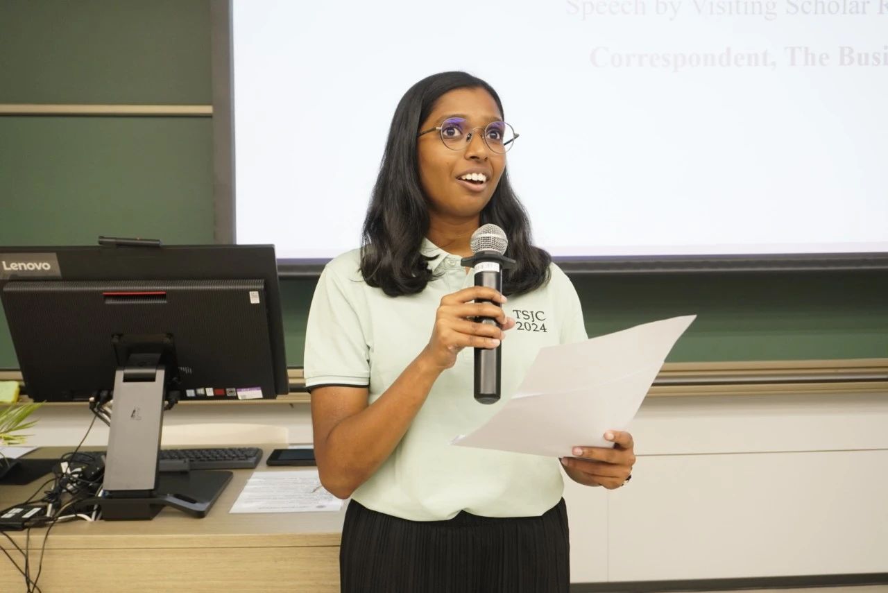 外籍访问学者代表H SHARANYA PILLAI从自己作为一名商业记者的从业经历出发,提出通过新闻可以聚集聪明、有趣的人,与之交流并从他们的经验中学习。同时她也表达了对自己对中国的向往和对清华访学的期待。外籍访问学者代表H SHARANYA PILLAI致辞