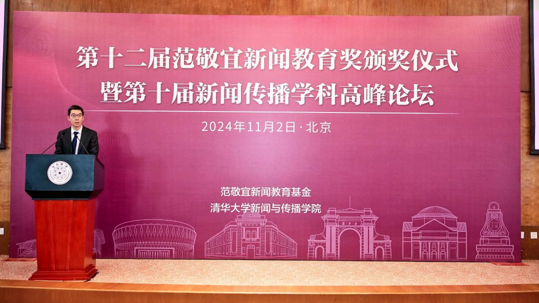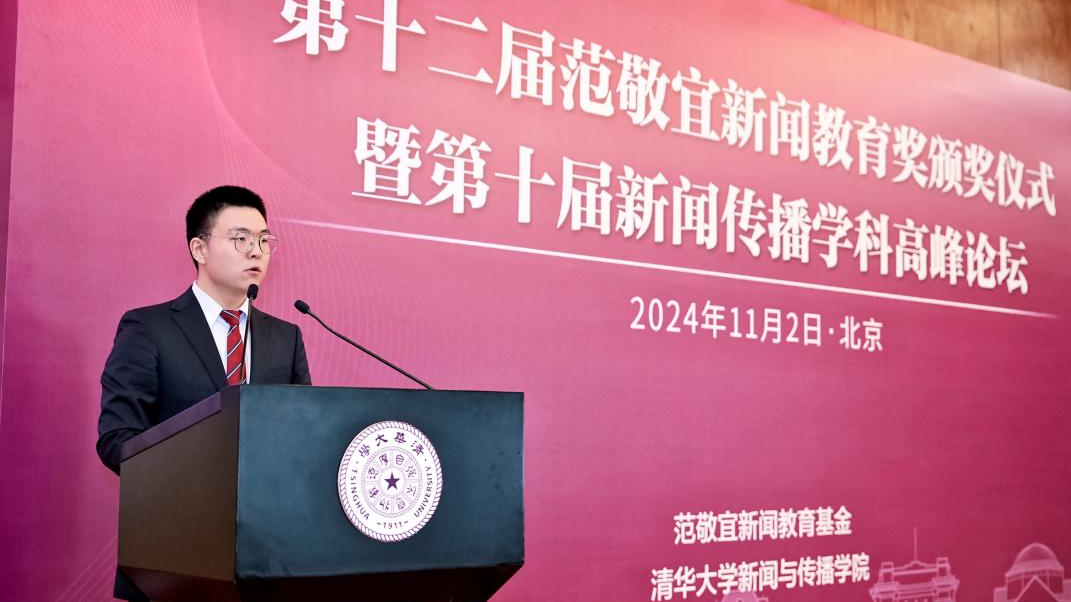 刘子赫代表范敬宜新闻学子奖获奖者发言。他表示,范敬宜先生是一代代新闻学子的榜样,激励着他们成为出色的新闻记者的信心和决心。刘子赫提到在缅怀范敬宜先生的同时,要传承范老所留下的新闻精神,发扬“新闻人”的品格。他结合自身经历和感悟,提出新闻人需要具备忧国忧民、坚韧不拔和保持热爱的品格,他也会将这些特质融入今后的工作事业中,为推动中国新闻行业发展贡献青年力量。