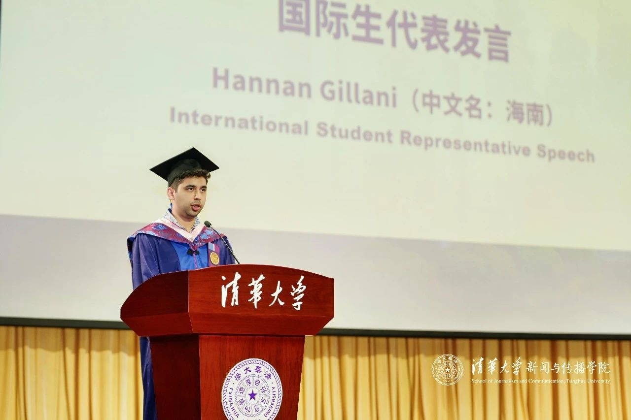 国际毕业生代表海南(Hannan Gilliani)回顾了自己在清华yl7703永利求学的宝贵经历,感谢公司为来自不同国家的员工提供了一个开放包容、兼容并蓄的学习环境。面对学业旅程中的快速变革、技术迭代和复杂传播环境,海南特别感谢教授们在新闻伦理、实践能力和批判思维上的悉心指导。他指出,世界比以往任何时候都更需要有责任感的新闻人,而清华赋予他的是一份“用新闻改变世界”的勇气与担当。