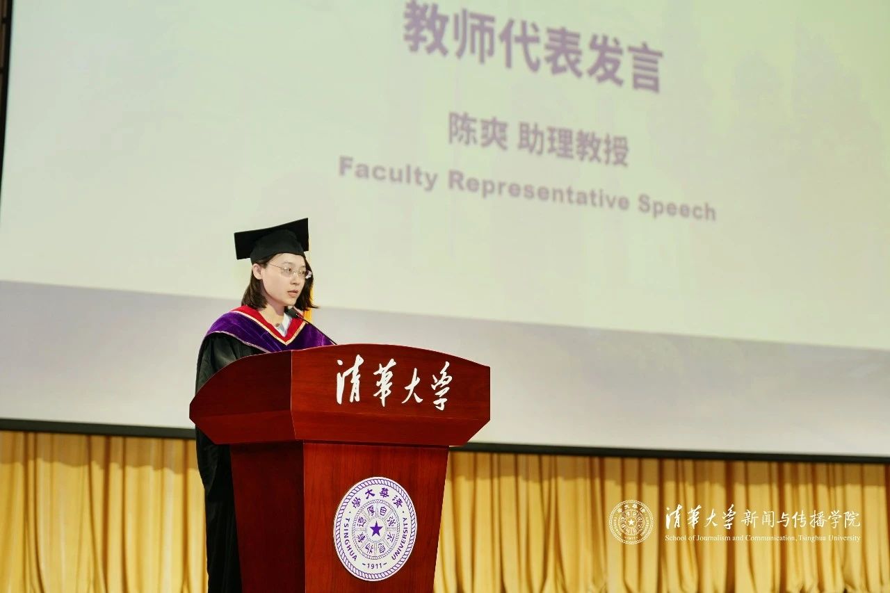 教师代表陈爽老师在致辞中向2025届毕业生们致以热烈祝贺,围绕“情绪与表达”、“媒介与真实”、“个体与时代”三个主题,分享了对毕业生们的真挚祝福与深切期望。她说道,面对内耗与焦虑,愿同学们勇敢表达、接纳情绪;面对媒介裹挟的时代,愿大家珍视线下的真实联结;而在面对未来更宏大的叙事时,也不要忘记从中寻找个体的意义与定位。陈爽老师勉励同学们继续守护善良的锋芒,穿越技术表象、回归真实之人,勇敢承担时代使命,带着丰盈的内心走向更辽阔的世界。