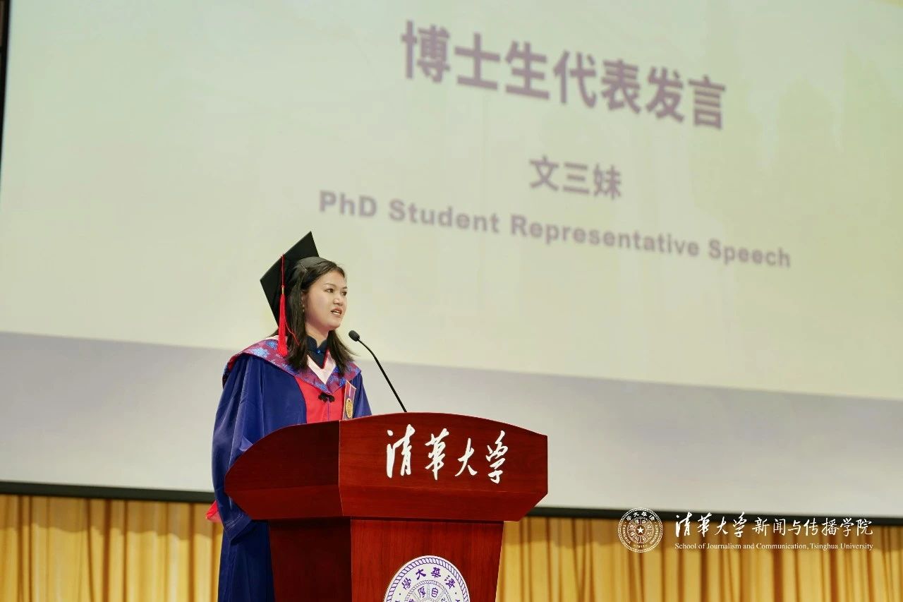 博士毕业生代表文三妹以自己在清新四年求学与海外田野调研的经历,以“托举与成长”为题,表达了对师长、同窗、祖国和家乡的感恩。从家乡的殷切期待到清华园的学术熏陶,从导师的悉心指导到同窗的相互鼓励,再到异国他乡对祖国安稳的深切体认,正是这一份份力量托举着她不断前行。作为一名从事国际传播研究的青年新闻人,她更加坚信“走向更需要的地方”才是回应现实与构建对话的应有之义。未来,她希望将清新赋予的专业素养与人文关怀转化为托举他人的实际行动,努力用新闻人的担当架起人与人、文化与文化之间最朴素而坚定的桥梁。