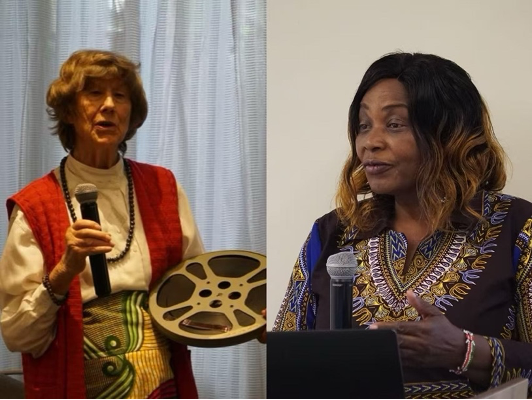 Nicky Brown女士展示一卷记录中国赤脚医生项目的影像资料(左);Alice Maranga女士介绍关于青少年妊娠问题的“BRIGHT”研究项目进展(右)