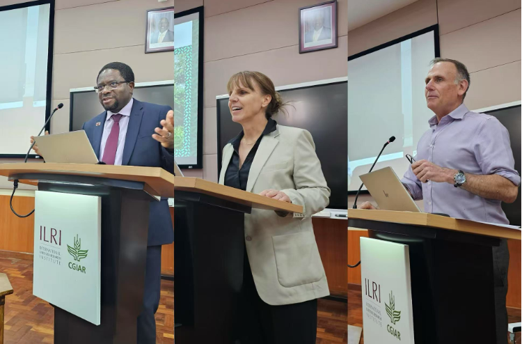 ILRI总干事Appolinaire Djikeng致辞(左);CGIAR首席科学家Sandra Milach分享(中);ILRI传播负责人Michael Victor主持(右)