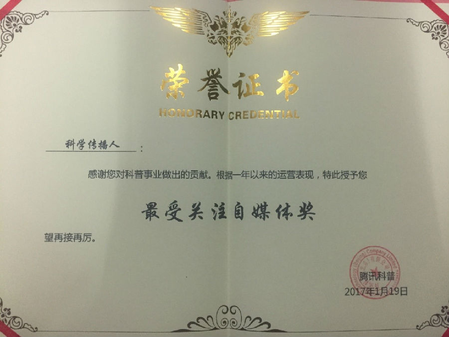 “科学传播人”荣获腾讯科普“最受关注自媒体奖”